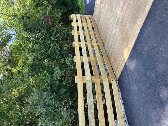 The new walking bridge includes a new bridge base ensuring stability and durability. The planned rebuild will involve several key components. The new walking bridge will include a new bridge base. Additionally, new decking will be installed, designed to mirror the aesthetic and material of the existing structures already present along the walking trail. Furthermore, new railings will be custom-built and installed for the bridge, enhancing safety for all users, maintaining a cohesive look and feel to existing walking trails.